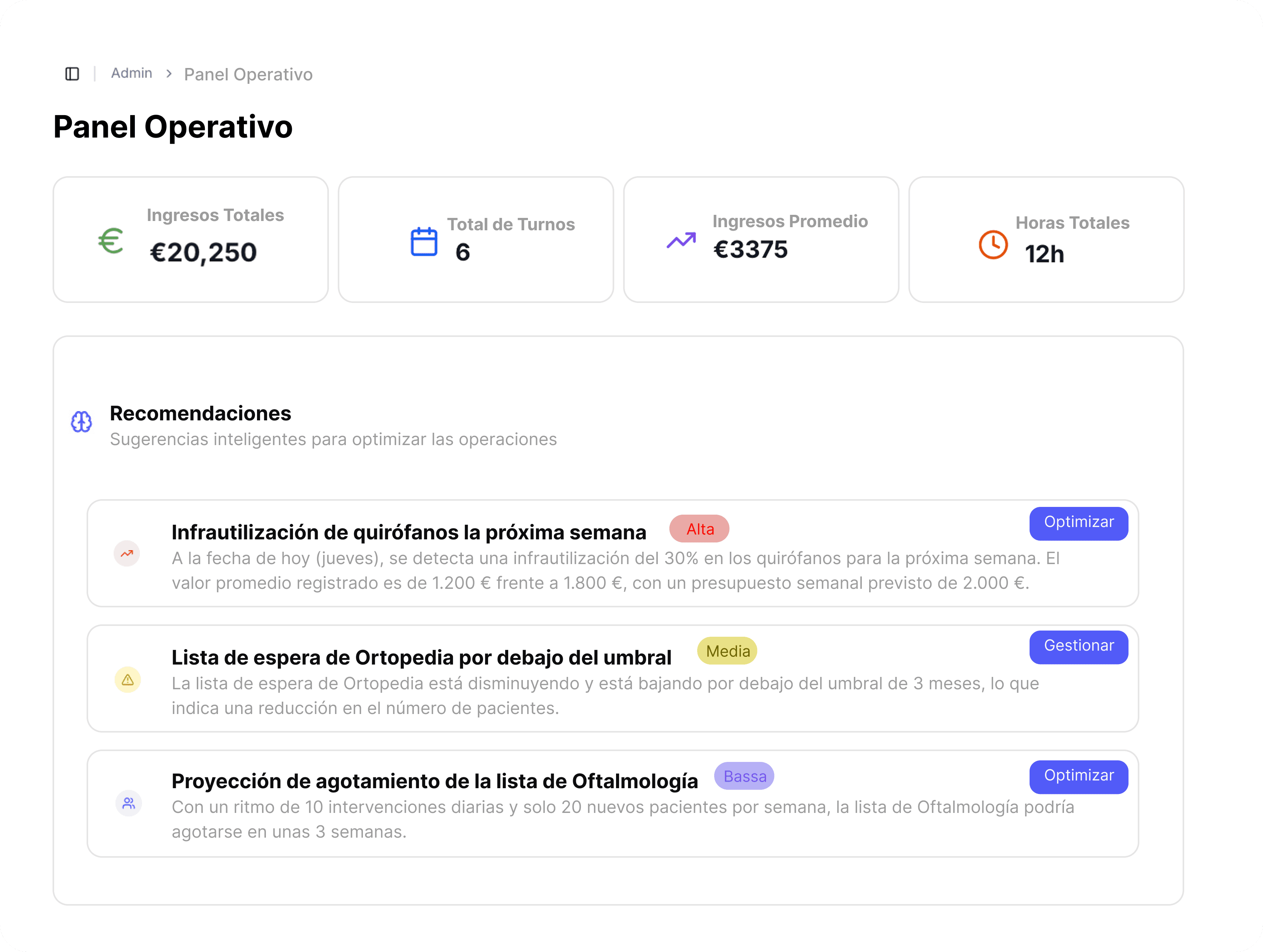Optimiza la programación quirúrgica y mejora la utilización de los quirófanos mediante planificación inteligente.